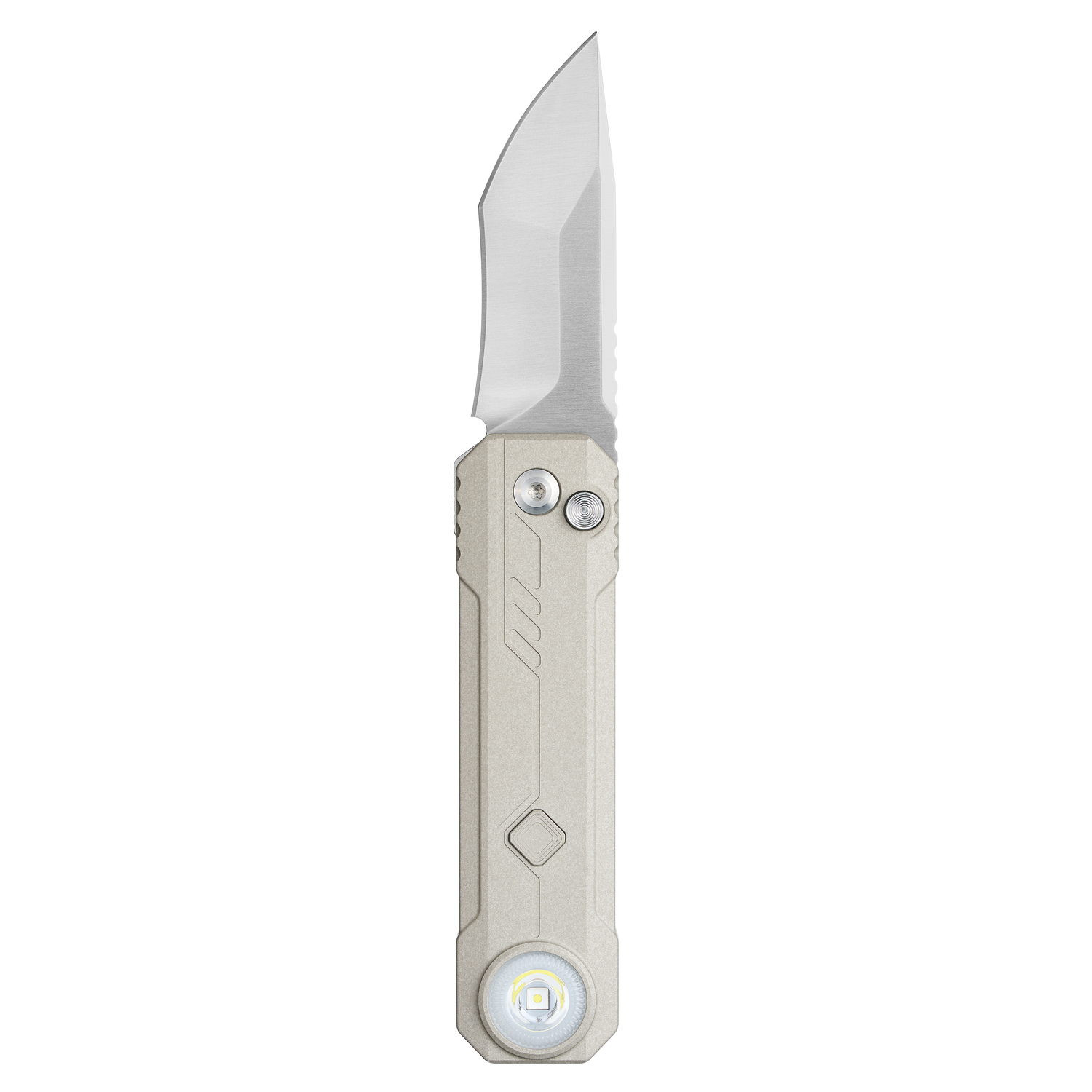 A seamless integration of a professional-grade folding knife and high-performance flashlight. Designed with clean, rectilinear geometry, this compact tool stands upright with architectural presence. Built for the minimalist, it maximizes capability while minimizing pocket space—delivering two essential tools without compromise.