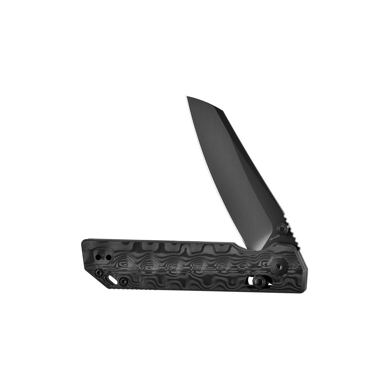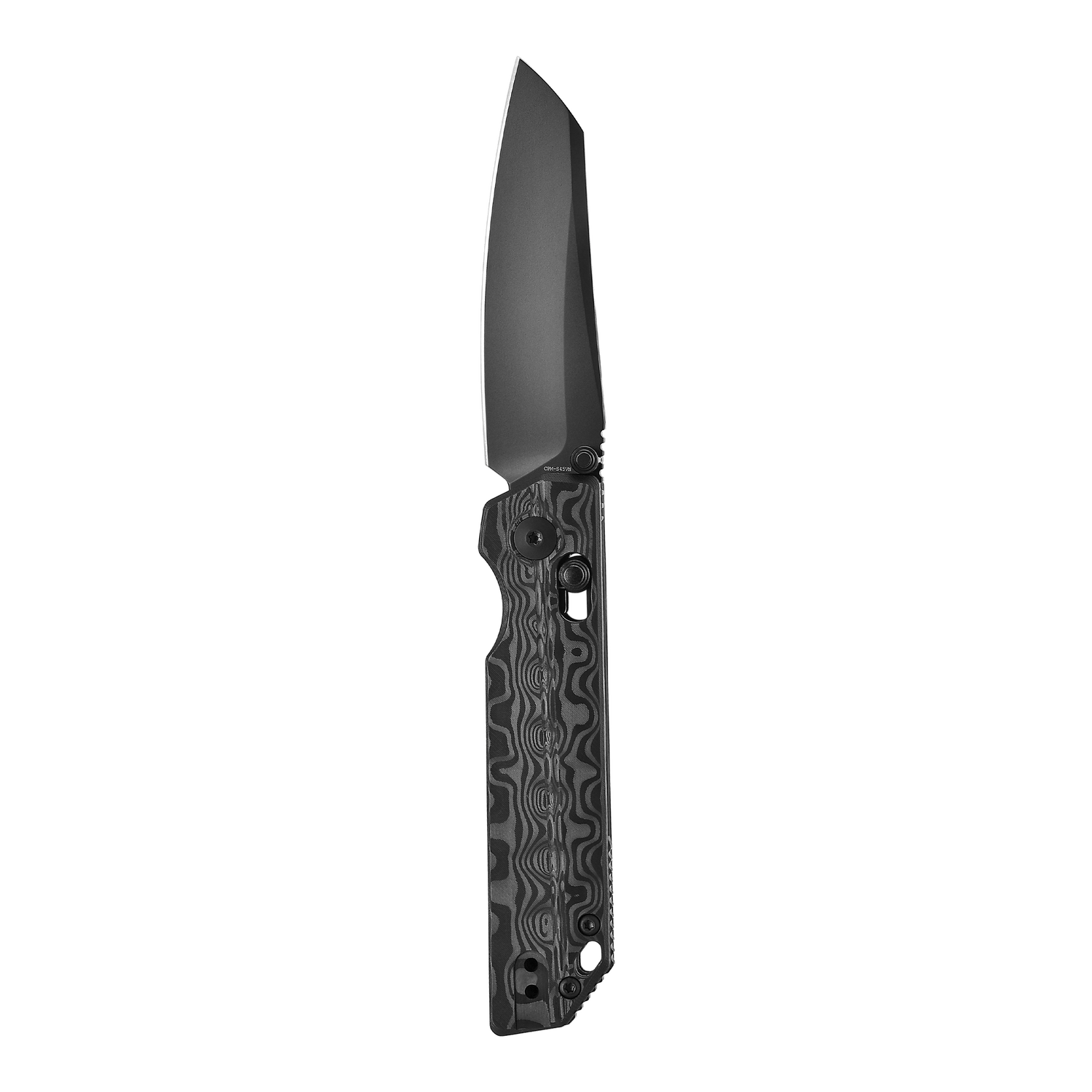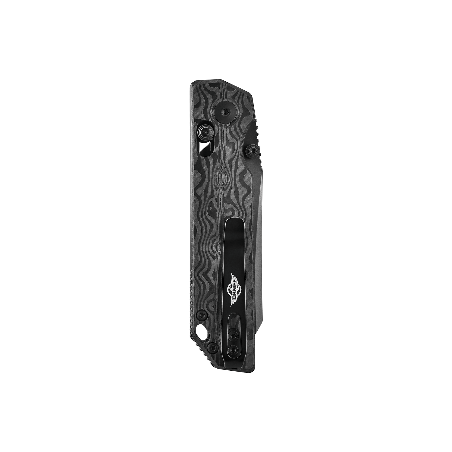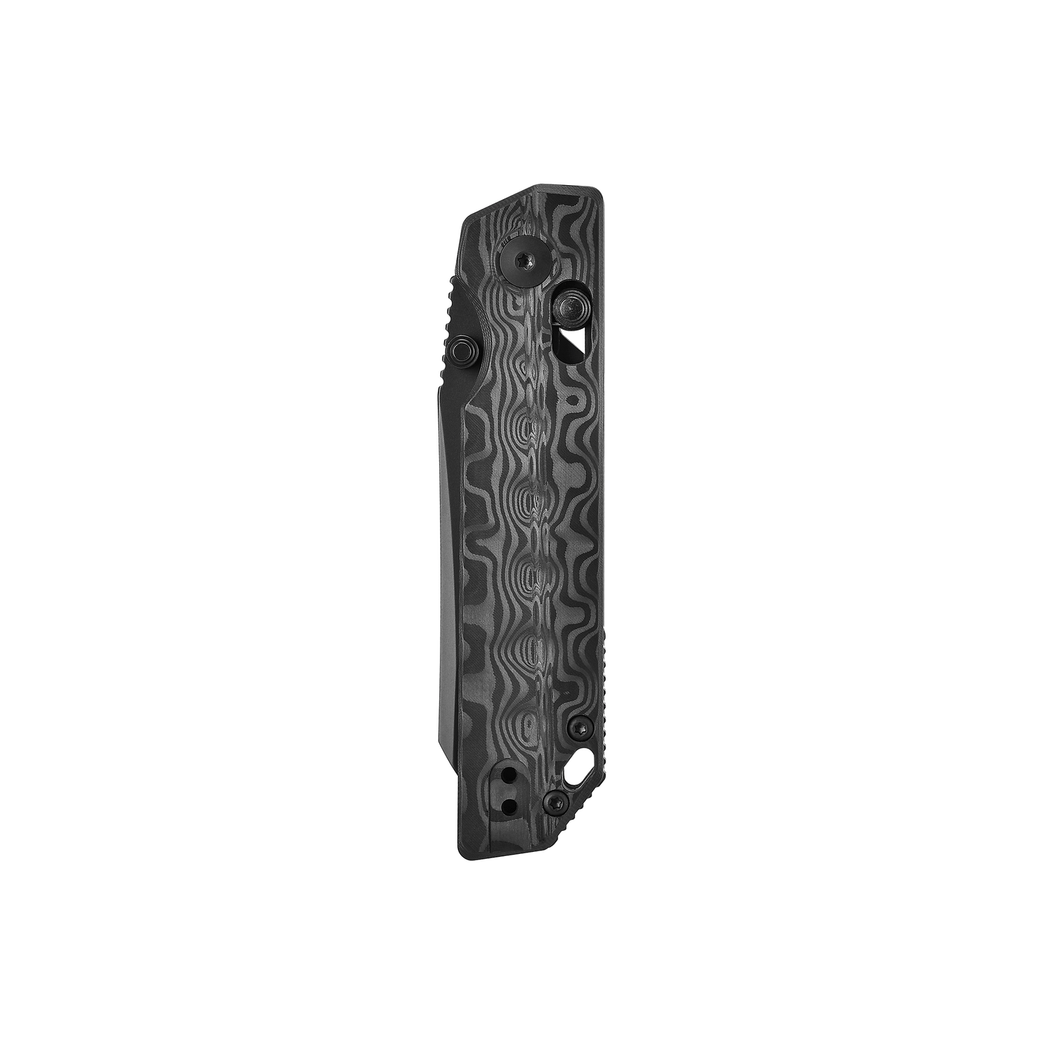 Crafted from layered carbon fiber and precision-machined to reveal a flowing Damascus-style pattern.